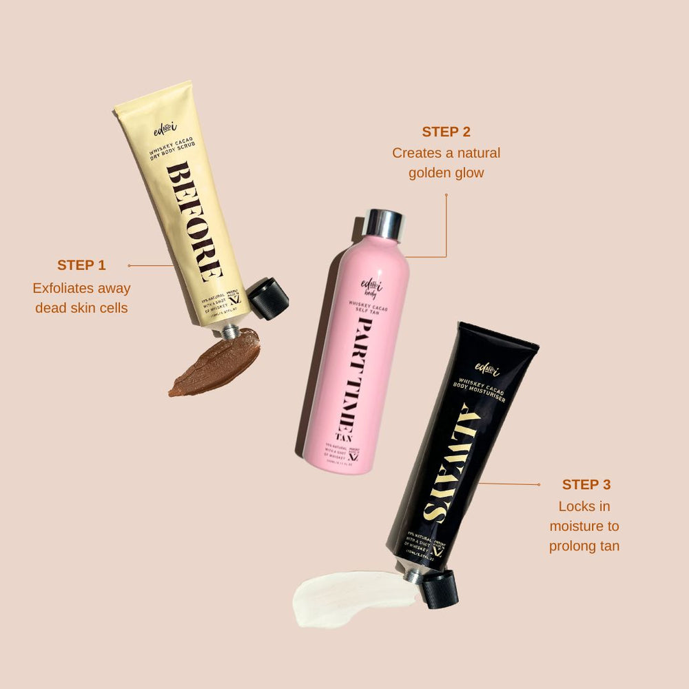 Your skins golden glow made possible all year round with ed&i body PART TIME tan. ed&i body PART TIME tan can create the tan you want. From light to medium to dark, our tan is suitable for all. Made with real whiskey and the scent of whiskey cacao. ed&i body is designed to give every woman body confidence.